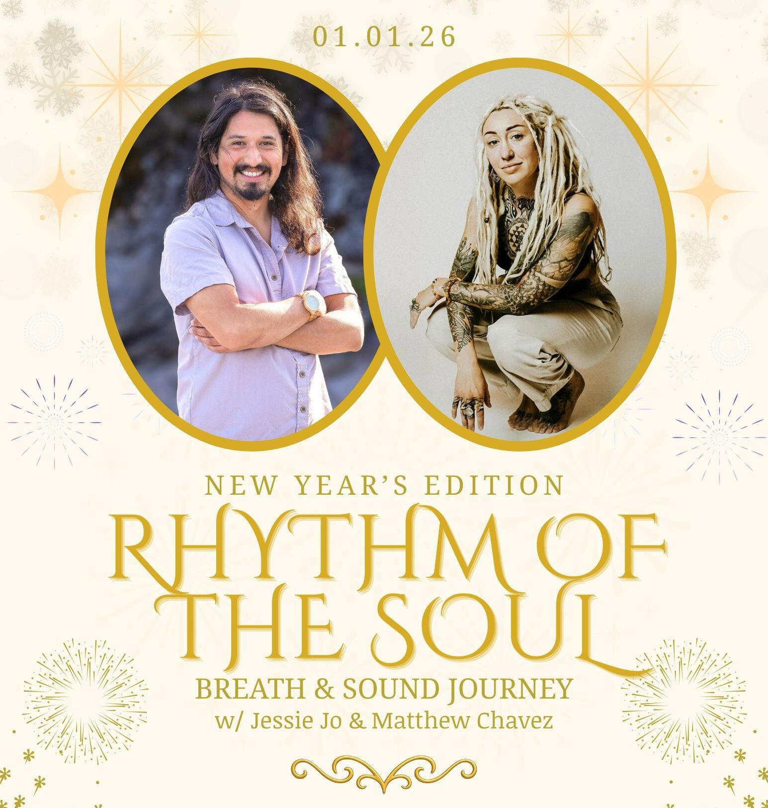 Join Jessie Jo and Matthew Chavez for a special New Year’s edition of Rhythm of the Soul, a ceremonial fusion of breath and sound designed to help you cross the threshold into a new chapter with clarity, grounding, and intention.